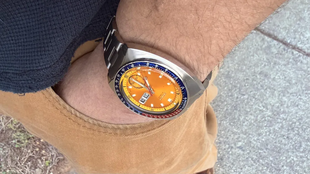 This is a thick, solid link bracelet made to the measurements of the original tapered H-link that went with the 6139-600x Chronographs. It has 6 removable links and 8 spots on the clasp for micro-adjustments. It will fit a very large wrist.