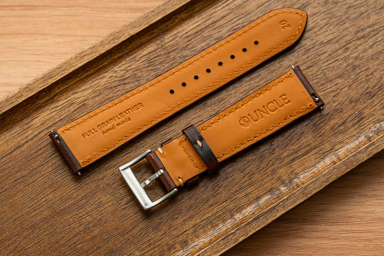 Each of my leather straps comes with quick-release spring bars for convenient strap changes, a handsome stitched border and a classy yet robust brushed buckle.