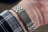 It tapers from 20mm to 16mm and has 8 removable links (screws like the original). It is a solid link bracelet with standard (hollow) end-links. As always, each bracelet comes with a pair of 2.5mm "fat boy" spring bars.