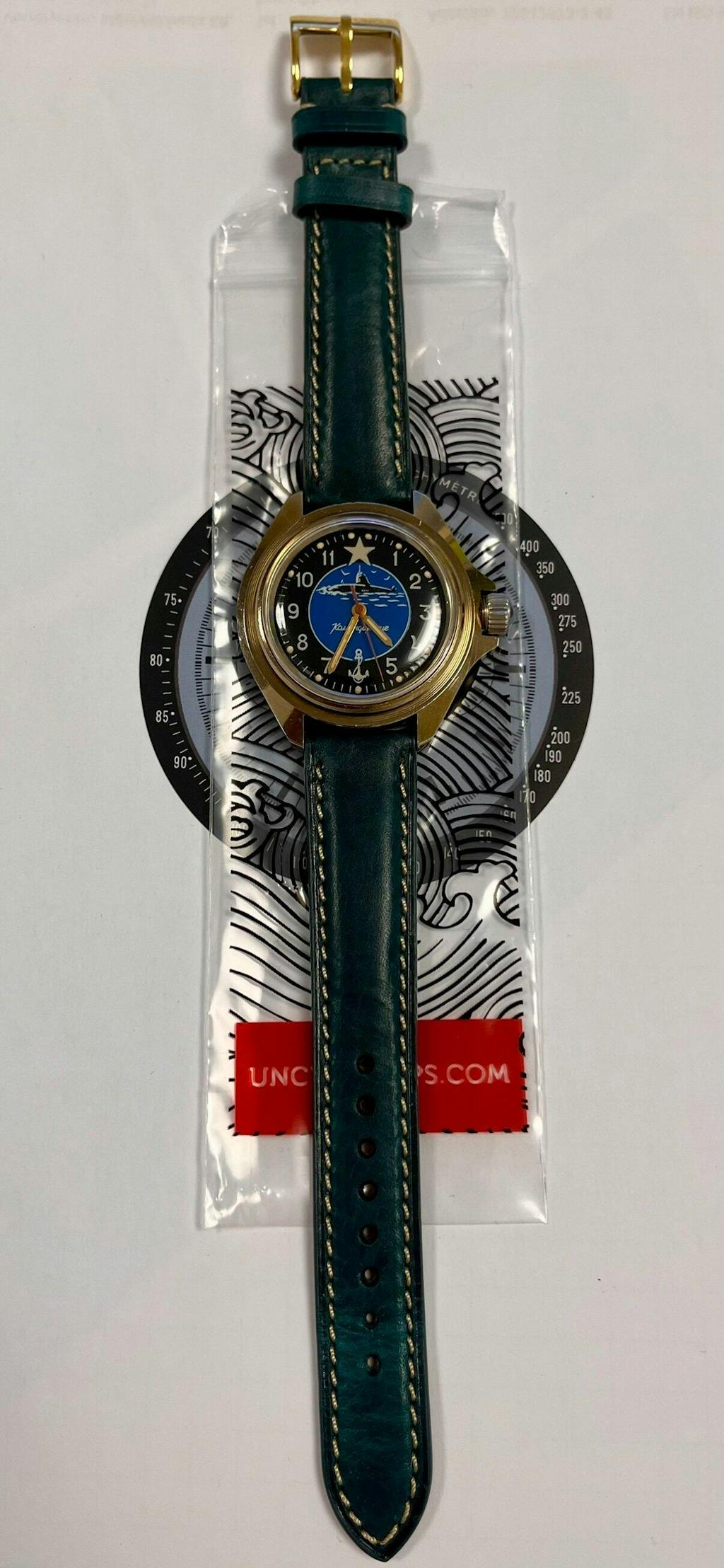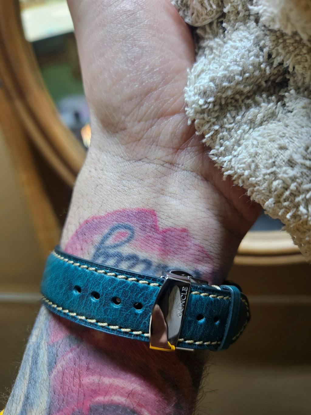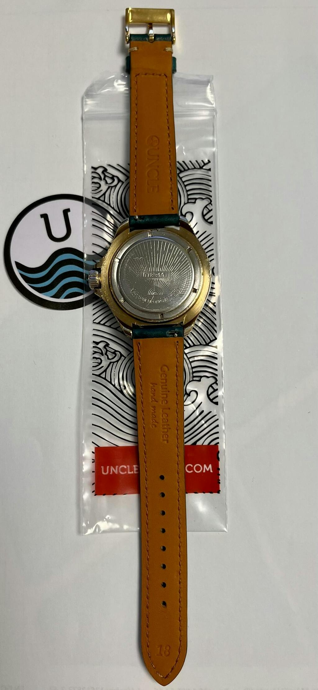 The pictures don’t do this strap justice; it has a beautiful, deep turquoise colour. I also added the gold buckle to match the case. It looks great on my grandpa’s old watch.