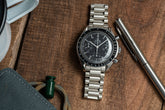 Introduced in 1988, the Speedmaster Reduced was sold as the smaller and less-expensive version of the classic Speedmaster. What makes it stand out among Omega enthusiasts is its reduction in size (hence the name). What's been lacking during its two-decade-long production run have been bracelet options.