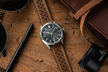 The rally strap, originally designed for motorsport enthusiasts in the 1960s, is renowned for its distinctive perforations. The holes were initially meant to enhance breathability and reduce weight, providing comfort and practicality for drivers navigating long, grueling races.