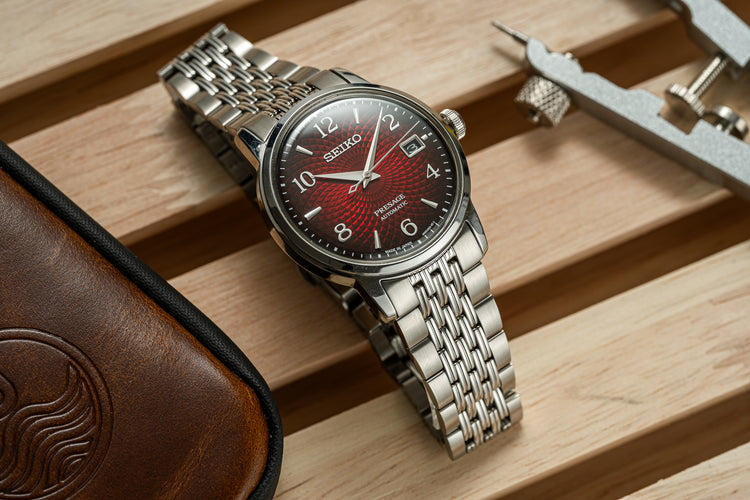 The Seiko Presage Cocktail Time series is a beloved choice for dress watch enthusiasts, and the redesigned 38.5mm models bring a fresh, vintage-inspired flair. These “second-generation” Cocktail Time watches continue the look and feel of the first-gen models, but with a vintage feel. Featuring a smaller case and some truly eye-popping dials, these also carry forward the cocktail nicknames like “Old Clock” and “Mojito.”