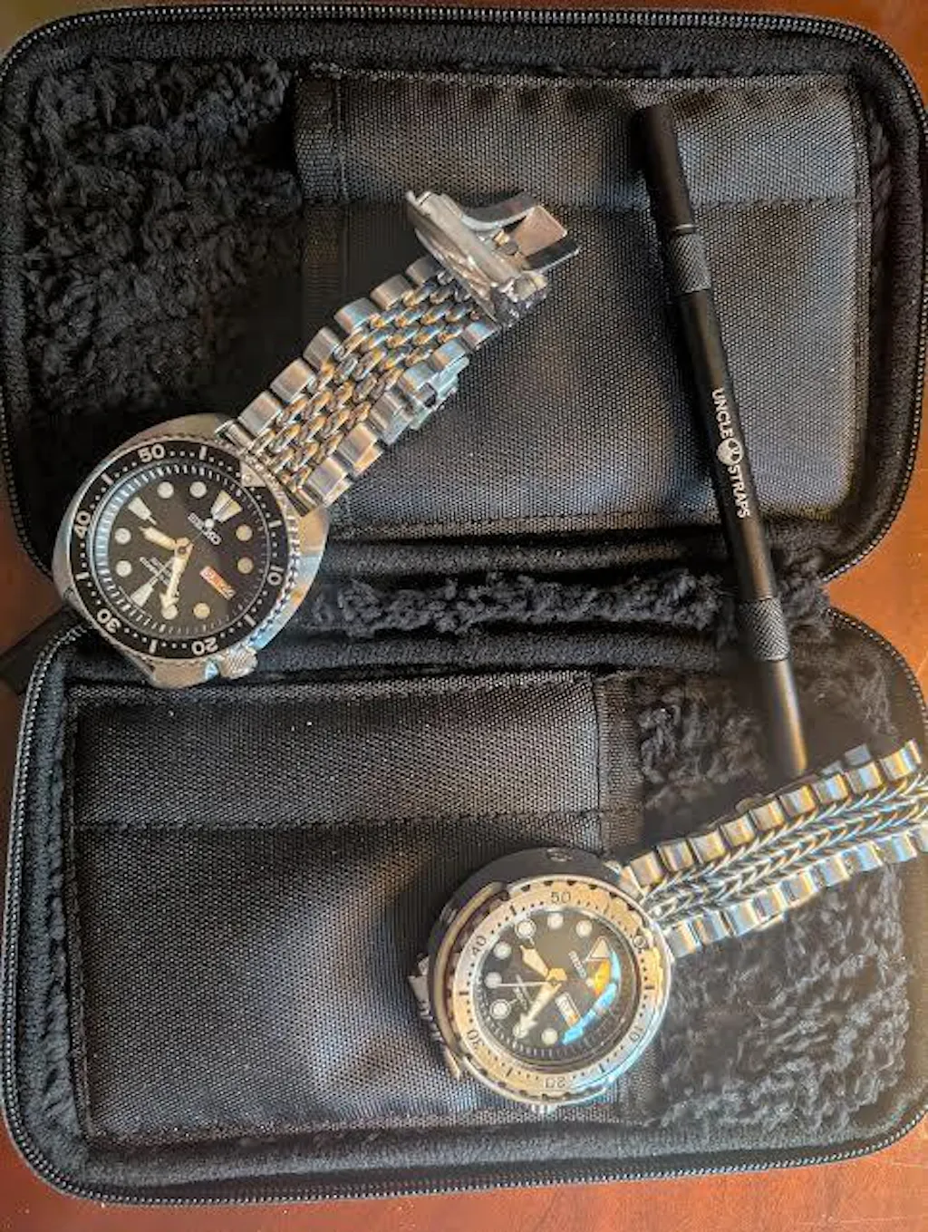 The unique interior is designed to maximize the internal storage and prevent the case from becoming too bulky when closed. Each side contains two sherpa-lined pockets. The larger slot is great for your watch, knife, light, etc, and the thinner is intended for a spring bar tool, pen, thin screwdriver, etc.