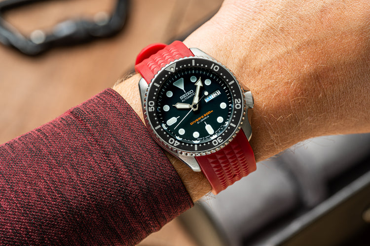 PLEASE NOTE: This is a custom waffle strap made specifically for the SKX007/SKX009 and its variants. This also includes the new Seiko "5KX" and Seiko SKK GMT models if you use the stock Seiko spring bars. It will not be compatible with other 22mm divers. If you need a universal 22mm waffle strap, go to this page.